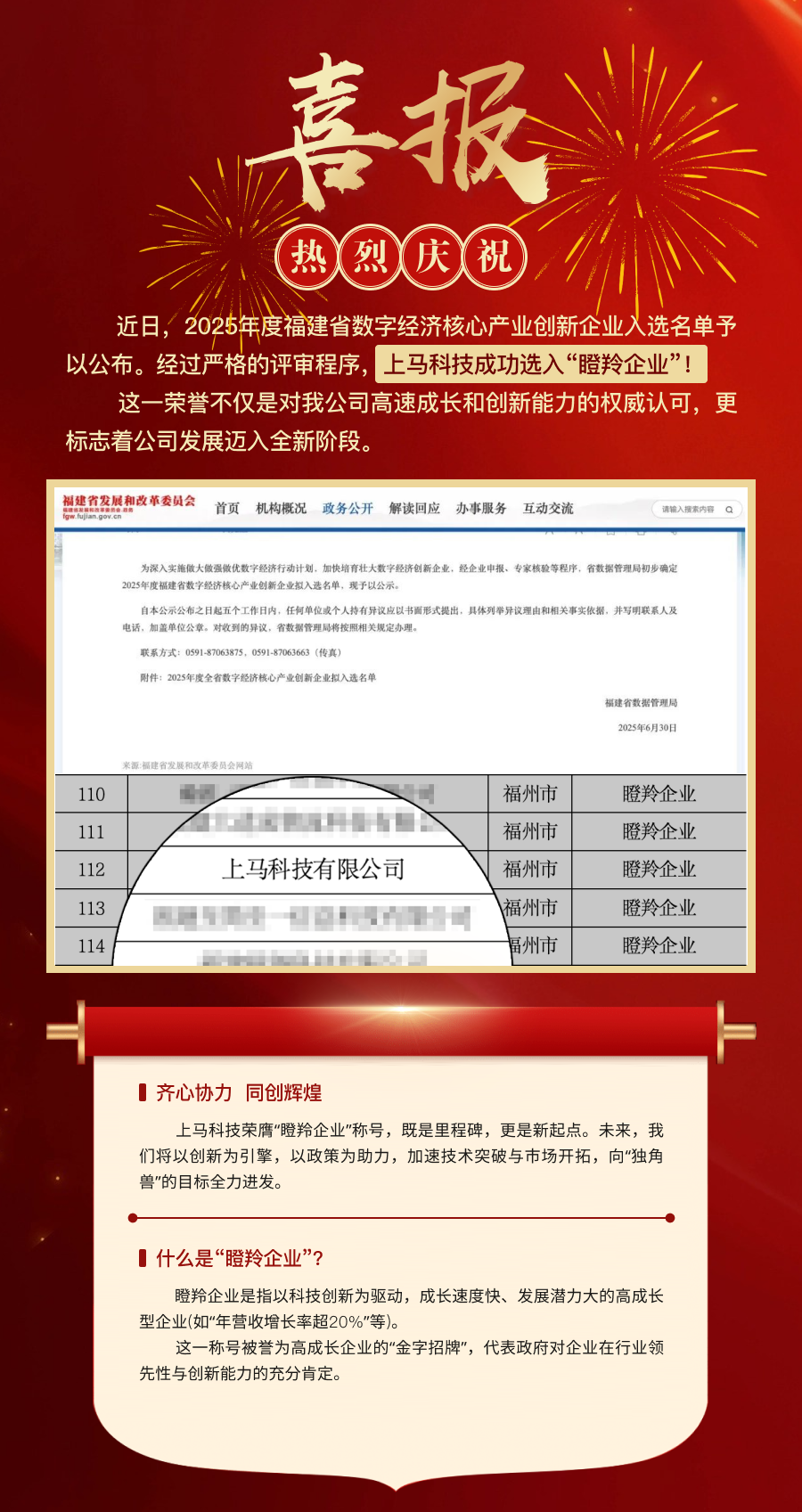 热烈祝贺:上马科技荣获2025年“瞪羚企业”称号!